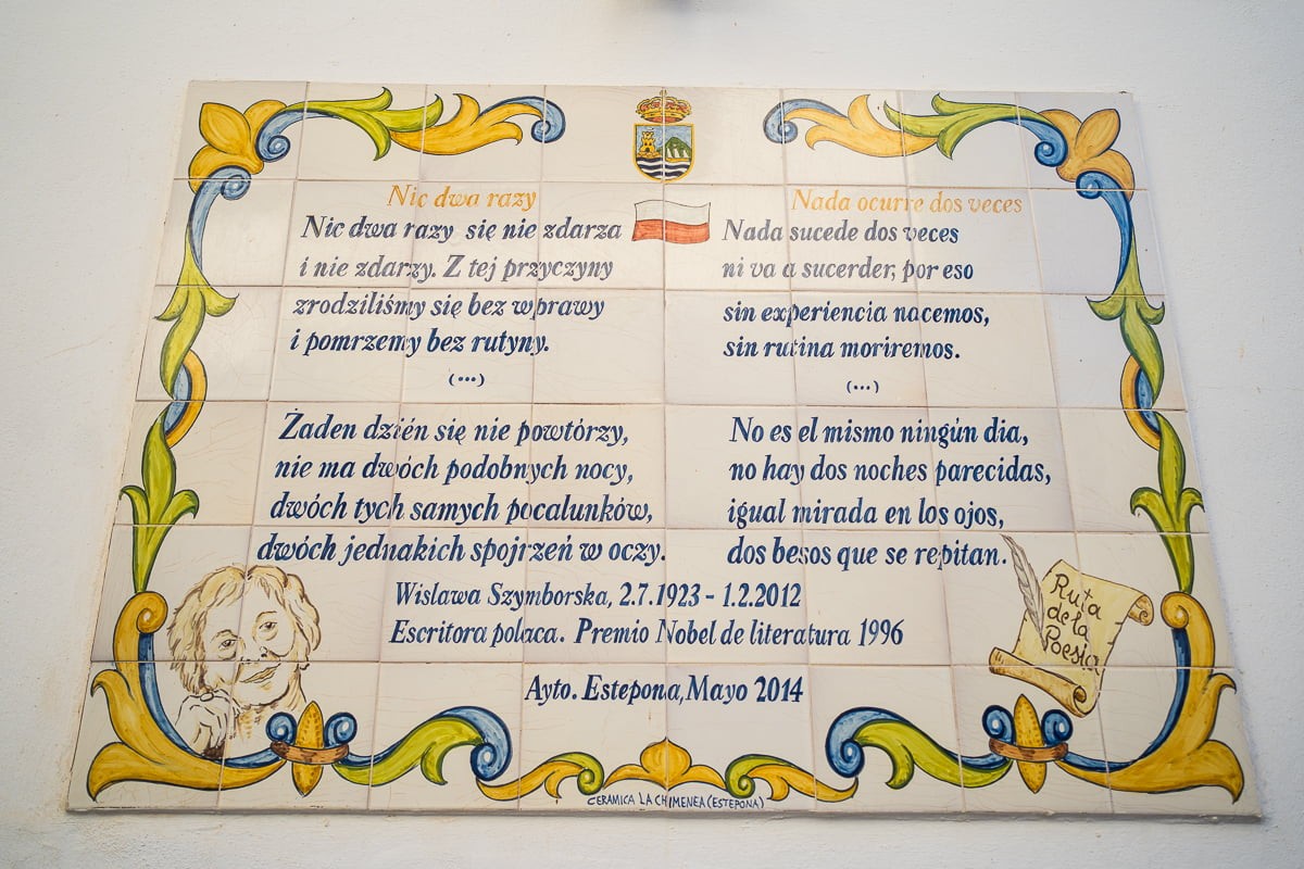 The Ruta de poesia is another of the trails that gives the city an amazing character and attracts tourists and art fans. In various corners of Estepona’s historic centre there are 30 plaques in the style of azulejos (painted tiles derived from the Arabic architectural style – mudejar), on which we can find the content of poems by renowned poets. Much of the poetry displayed on the city’s walls is the work of Spanish poets, but there is also no shortage of foreign authors. Among them is a Polish accent – one of the walls features a poem by the Nobel Prize winner Wisława Szymborska entitled „Nothing Twice”.