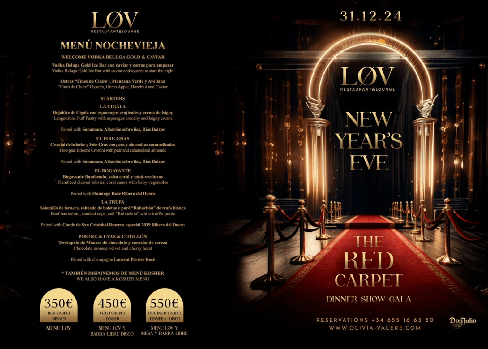 Here you can feel like a film star. An unforgettable New Year’s Eve in red carpet style awaits you at the Olivia Valere & Lov restaurant. For more information visit: olivia-valere.com/lov and call +34 655 16 63 50.